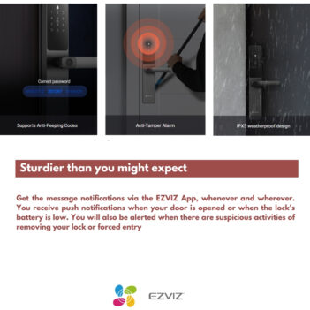 Get the message notifications via the EZVIZ App, whenever and wherever. You receive push notifications when your door is opened or when the lock’s battery is low. You will also be alerted when there are suspicious activities of removing your lock or forced entry.